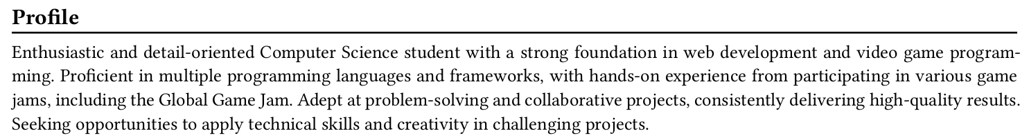 The rest of the template is pretty straight-forward. It uses every we have seen so far. From my experience and what I learned in class, a Computer Science resume usually has the following sections: profile, education, work experience, projects, and volunteering (if you have any experience to put here).